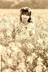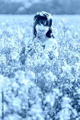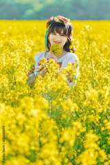 Beautiful young woman in Ukrainian embroidered standing in a field of yellow rape flowers