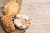 Assortment of freshly baked bread with napkin on rustic table top view. Healthy unleavened bread. French bread