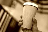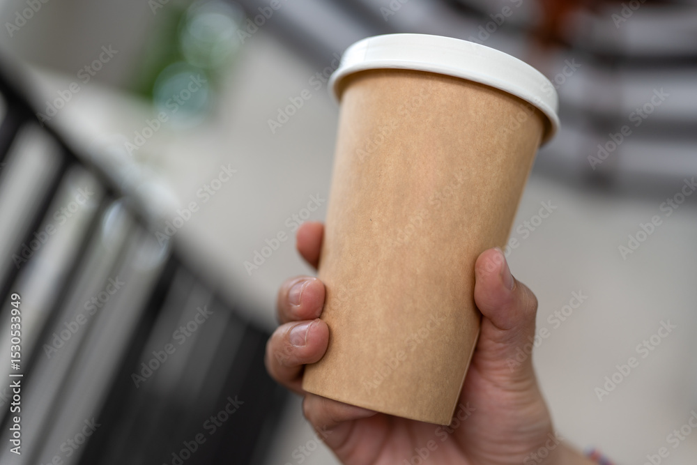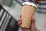 A hand firmly holds a brown paper cup with a white lid, commonly used for hot coffee or takeaway drinks.