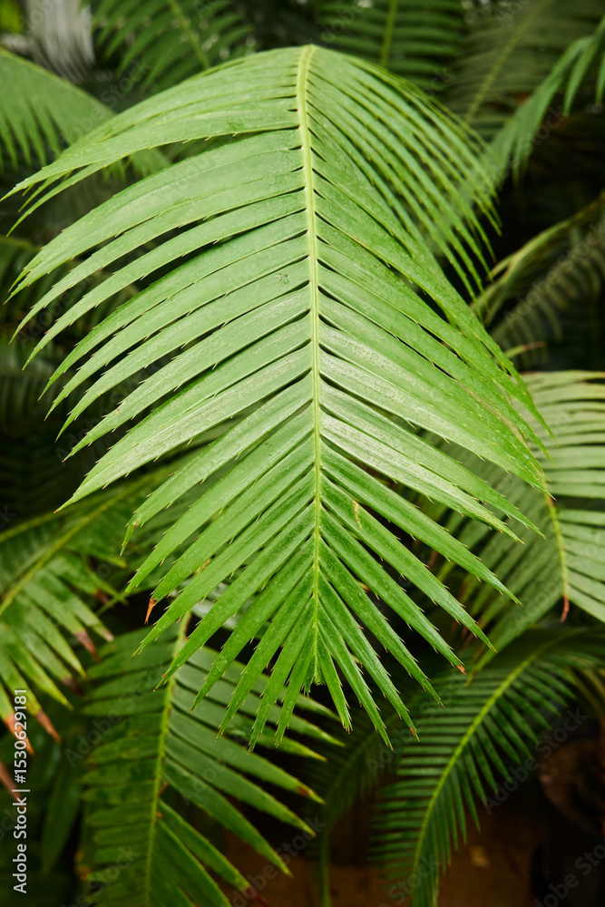 Tropical greenhouse. Woody plants of the Palm family. Close-up