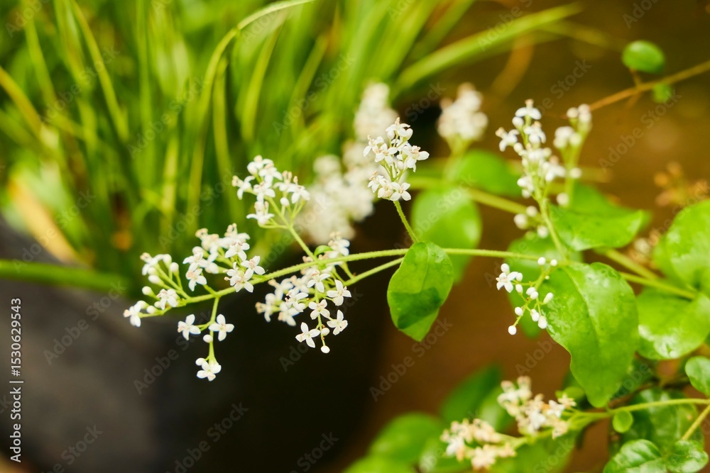 Tropical greenhouse. The plant is a northern bedstraw. Close-up