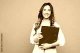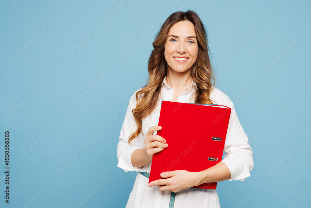 Young employee business woman corporate lawyer she wear shirt classic formal clothes work in office hold red folder for papers document bookkeeping isolated on pastel blue background studio portrait