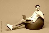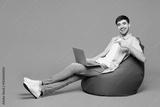 Full body young IT man he wears pink shirt t-shirt casual clothes sit in bag chair hold use work point on laptop pc computer isolated on plain pastel light purple background studio. Lifestyle concept.