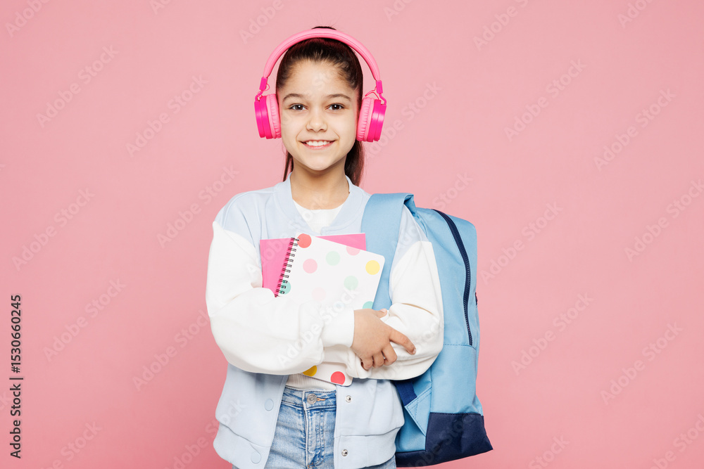 Young happy school girl 8-9 years old wear blue casual clothes backpack hold books listen to music in headphones isolated on plain pink background children portrait. Childhood kids education concept.