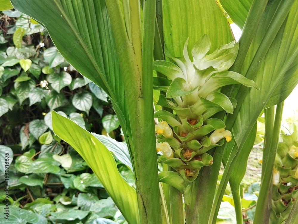 Turmeric flower (Curcuma longa) in outdoor garden, close up view