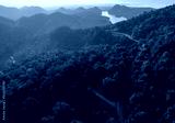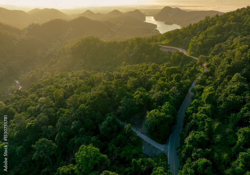 Landscape of green mountains with curve highway road and lake in the morning. Nature landscape. Watershed forest. Water and forest sustainability concept. Aerial view of mountain with green trees.