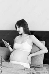 Emotional pregnant woman using mobile phone at home in bed