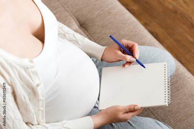 Pregnant woman makes notes. Concept of pregnancy, health care, medicine. Mother waiting of baby at the home
