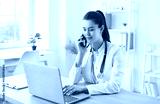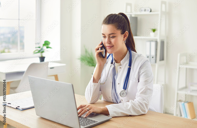 Cheerful young female doctor in uniform sitting at workplace at desk in office talking by mobile phone and working on a laptop computer in medical clinic. Health care and medicine concept.