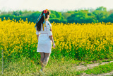Beautiful young woman in Ukrainian embroidered standing in a field of yellow rape flowers