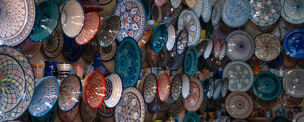 Moroccan ceramic plates, traditional pottery and market culture, local shop in Marrakech’s Medina, vibrant souks filled with traditional Moroccan detailed patterns and cultural artistry