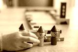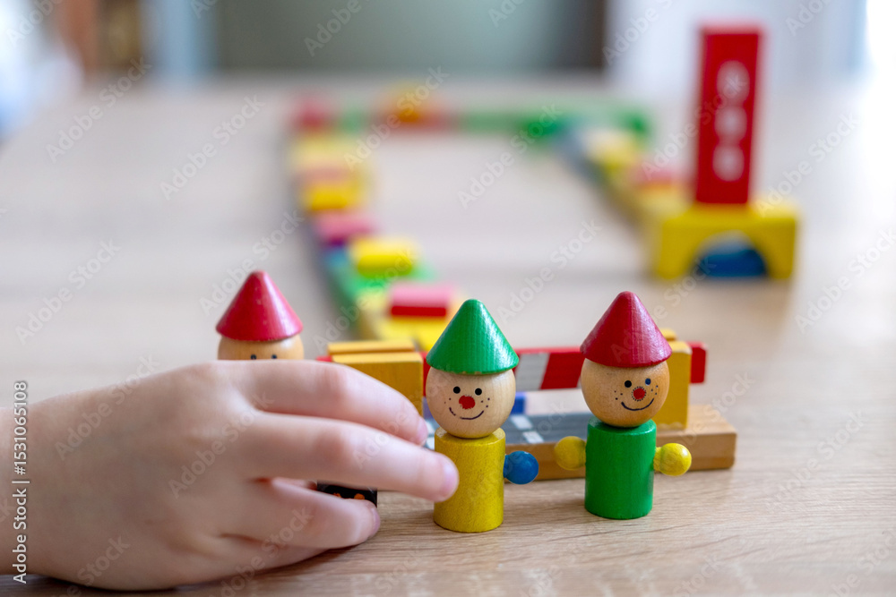 Child playing with wooden toys, play time, Colorful blocks and figures on table. Early education, fine motor skills concept