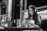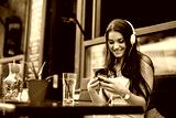 Beautiful young woman listening to music in sidewalk cafe via headphones