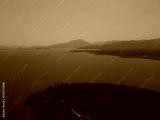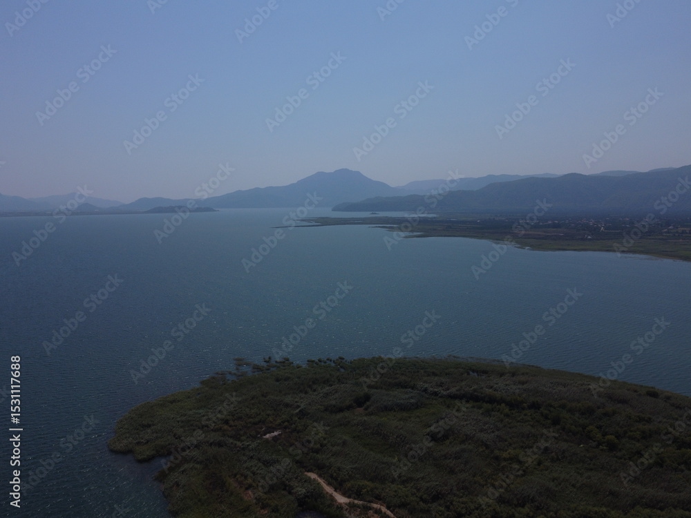 A serene aerial view of Lake Köyceğiz in Turkey on a calm summer day, showcasing tranquil blue waters, lush surroundings, and peaceful natural beauty.