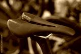 Detail of the sport saddle for bicycle. Elegant black and white racing saddle on the seat post, close-up.Racing bike.