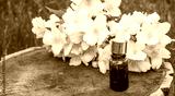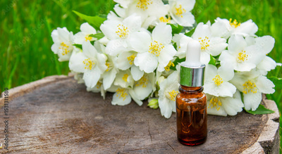 Jasmine essential oil in a glass bottle and jasmine flowers. Oils.