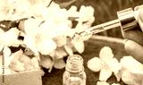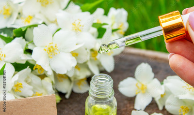 Jasmine essential oil in a glass bottle and jasmine flowers. Oils.