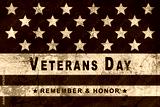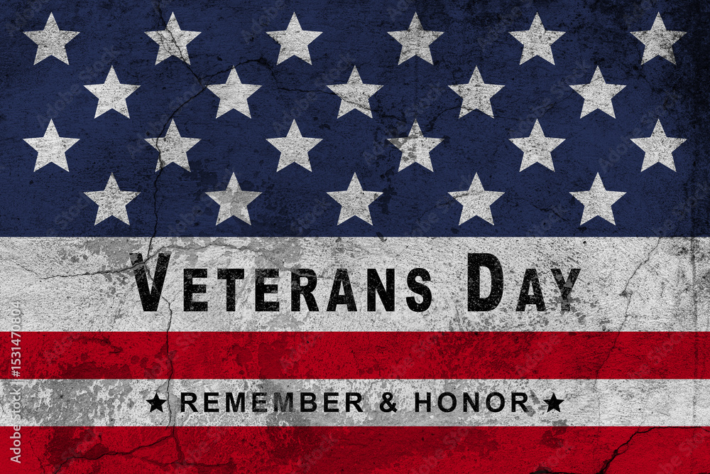 Veterans Day we are closed sign with retro US flag stars on weathered whitewash wall.