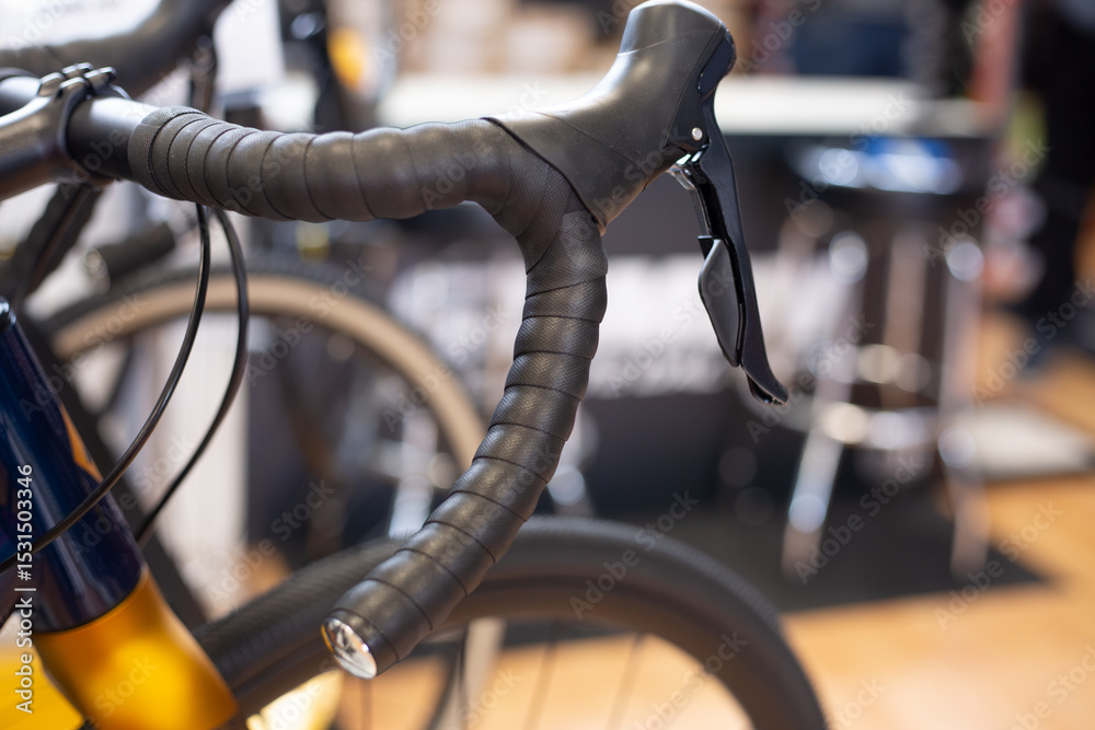 Elegant racing bike handlebars, side view photography. Bicycle design. Side profile of a professional gravel bike. Close-up.