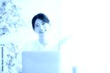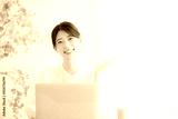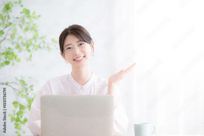 パソコンの前でカメラ目線の笑顔の女性 オフィスカジュアルのイメージ ピンクのシアーシャツのかわいい女性 オススメのポーズ