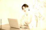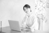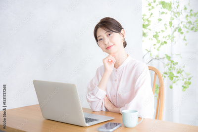 パソコンの前で考える オフィスカジュアルのイメージ シアーシャツの女性転職どうしようかな?カメラ目線