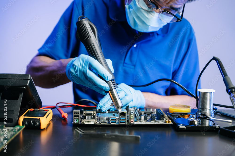 Technician in gloves performs precise soldering on circuit board using hot air gun. Concept of electronics repair