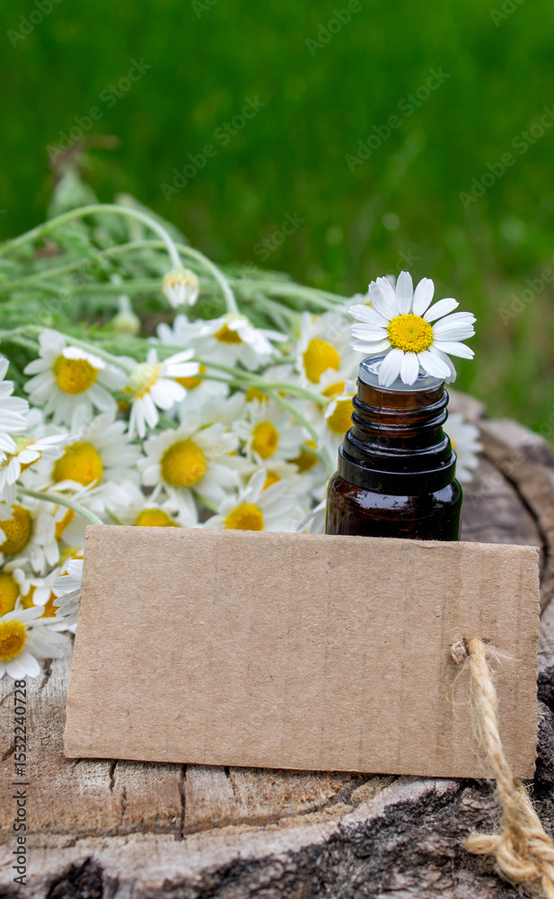 Chamomile Essential Oil Bottle with Fresh Flowers