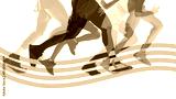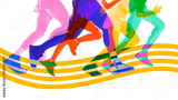 Contemporary art collage. Sequence of runners in layered motion stride across golden waves, with each step frozen in colored duotone rhythm. Motion effect. Concept of endurance, sport, motivation