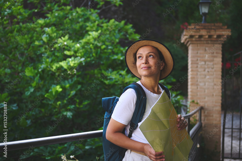 Woman Exploring Scenic Historic City With a Map and Backpack, Embracing the Beauty of Nature and Architecture