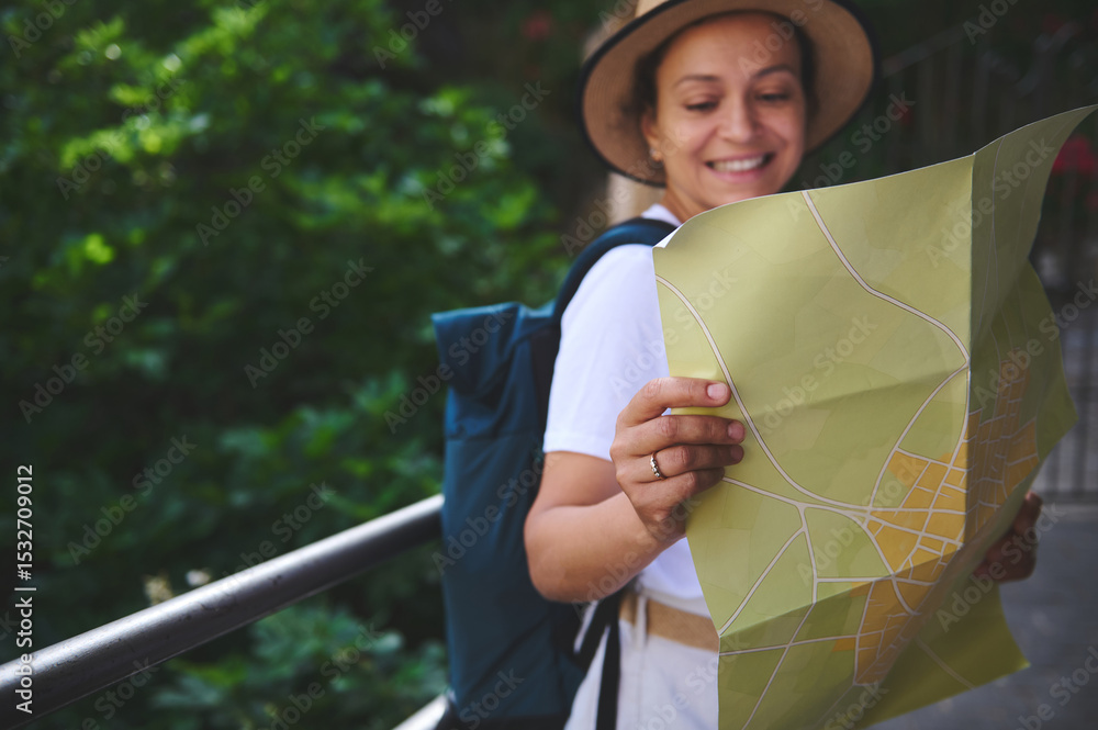 Woman Enjoying Exploration of a Scenic City While Using a Map to Navigate