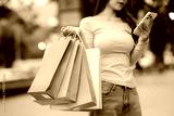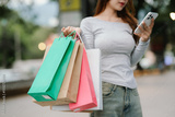 A young Asian woman with braces smiles while holding shopping bags and a smartphone outside a store.