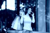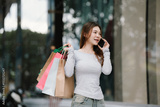 A young Asian woman with braces smiles while holding shopping bags and a smartphone outside a store.