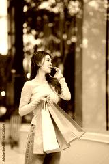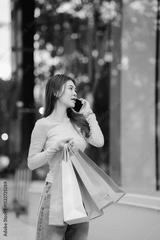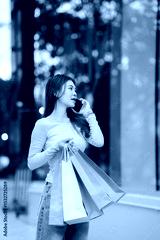 A young Asian woman with braces smiles while holding shopping bags and a smartphone outside a store.