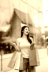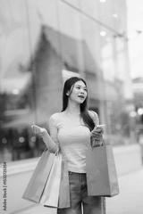 A young Asian woman with braces smiles while holding shopping bags and a smartphone outside a store.