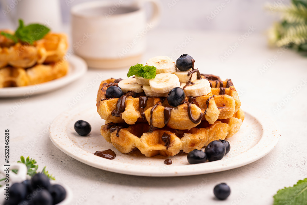 Tasty Belgian waffles with banana and fresh berries, cheese and chocolate on white table, close up. High quality photo