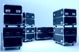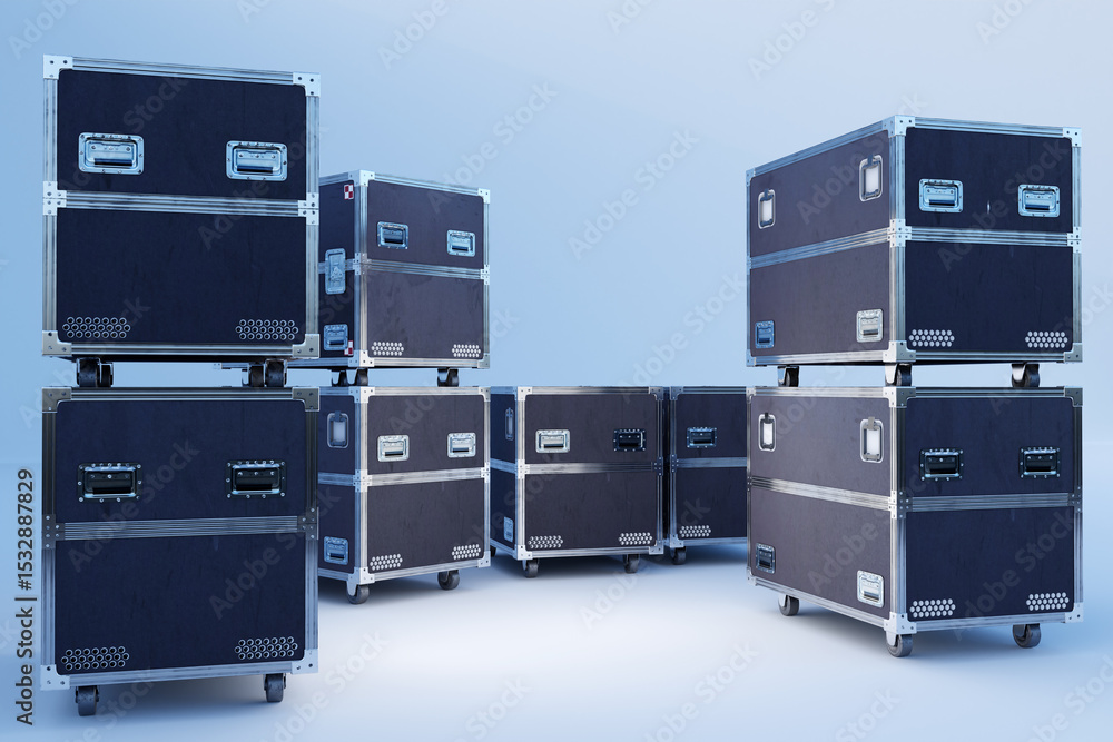 Multiple black rolling flight cases with metal edges and handles, arranged on a white surface, used for transporting equipment in logistics, events, and production – Logistics. 3d image