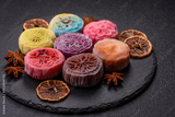 Chinese mooncake is an Asian sweet dessert. Asian mooncake as a background for your design