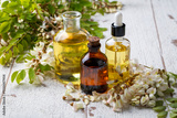 Robinia (false acacia) essential oil (remedy, extract) bottle with fresh acacia flowers