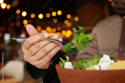 Enjoying a fresh salad at a cozy restaurant during dinner
