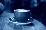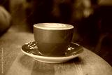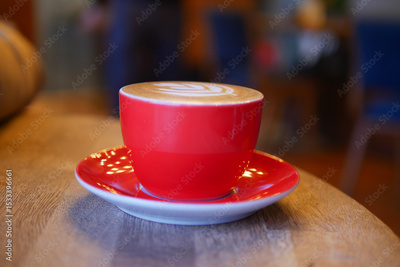 Coffee served in a vibrant red cup on a wooden table