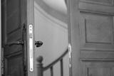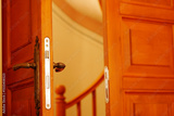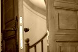 Open wooden door revealing curved staircase interior