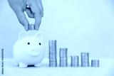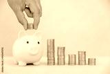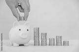 Hand and coin with piggy bank and pile coins stacked for growth real estate or money savings plan ideas and investment planning goal to growth and bank home loan or financial insurance.