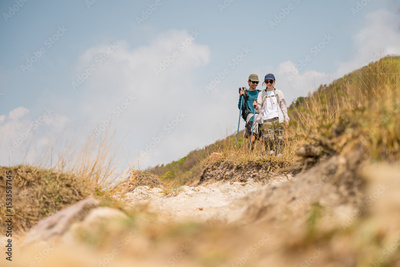 Hiker hiking trail journey, Trekking hike adventure, Walking lifestyles activity.