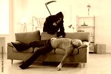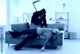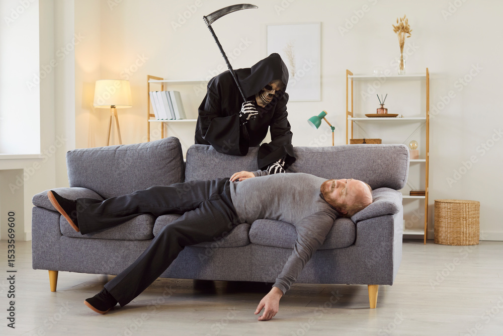 Senior man dying, Grim Reaper of Death with scythe finding new victim patient couch dying, Halloween cosplay costume, wearing dark cloak with hood, terminal illness, expected to end at home alone
