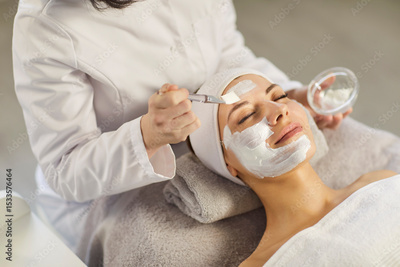 Dermatologist, cosmetologist beautician applying gently skin care cream mask with brush on female face, moisturizer, professional hygienic relaxing session in spa salon or clinic, beauty treatment