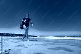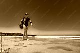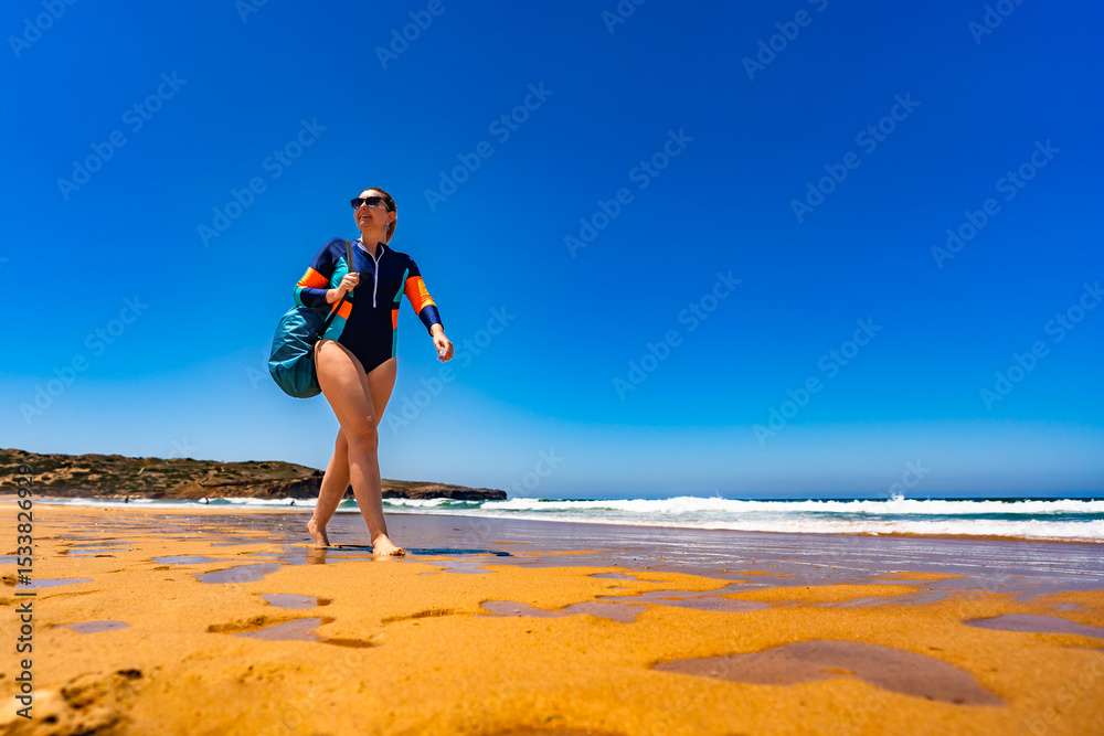 Beautiful middle aged woman in long-sleeve sports swimsuit walking on sandy beach on sunny summer day. Front view