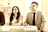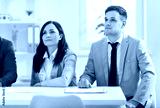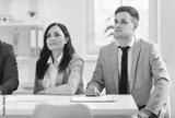 Colleagues participating and listening during a work team meeting, presentation or conference in office. Focused people showing commitment to collaboration and teamwork in the business environment.