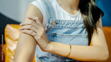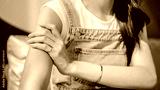 Young Asian woman hand holding her arm, feeling wrist pain and hurt while sits on sofa in living room at home. Asian female suffering, relief from wrist pain. Health care and medical concept.