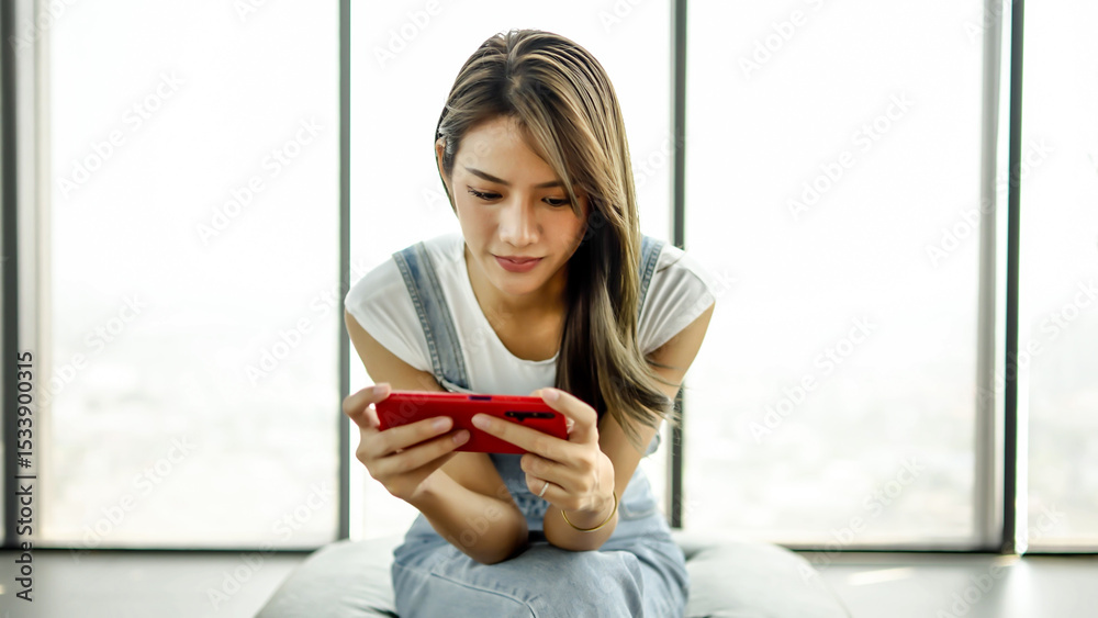 Happy young asian woman gamer winner competition play video game online with smartphone, excited girl screaming yes winning online game app on cell phone at home