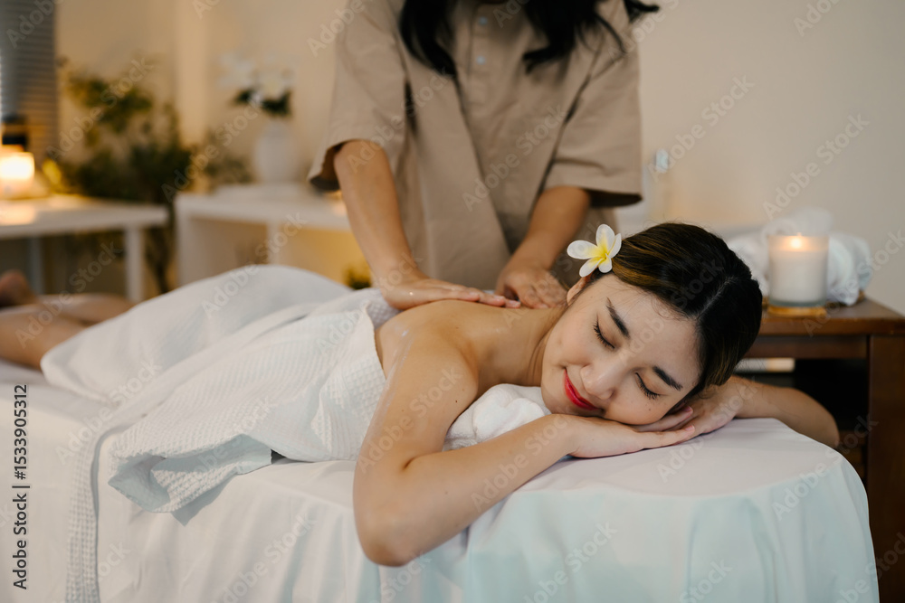 Relaxed woman lying on massage table while massage therapist massages her. Wellness concept